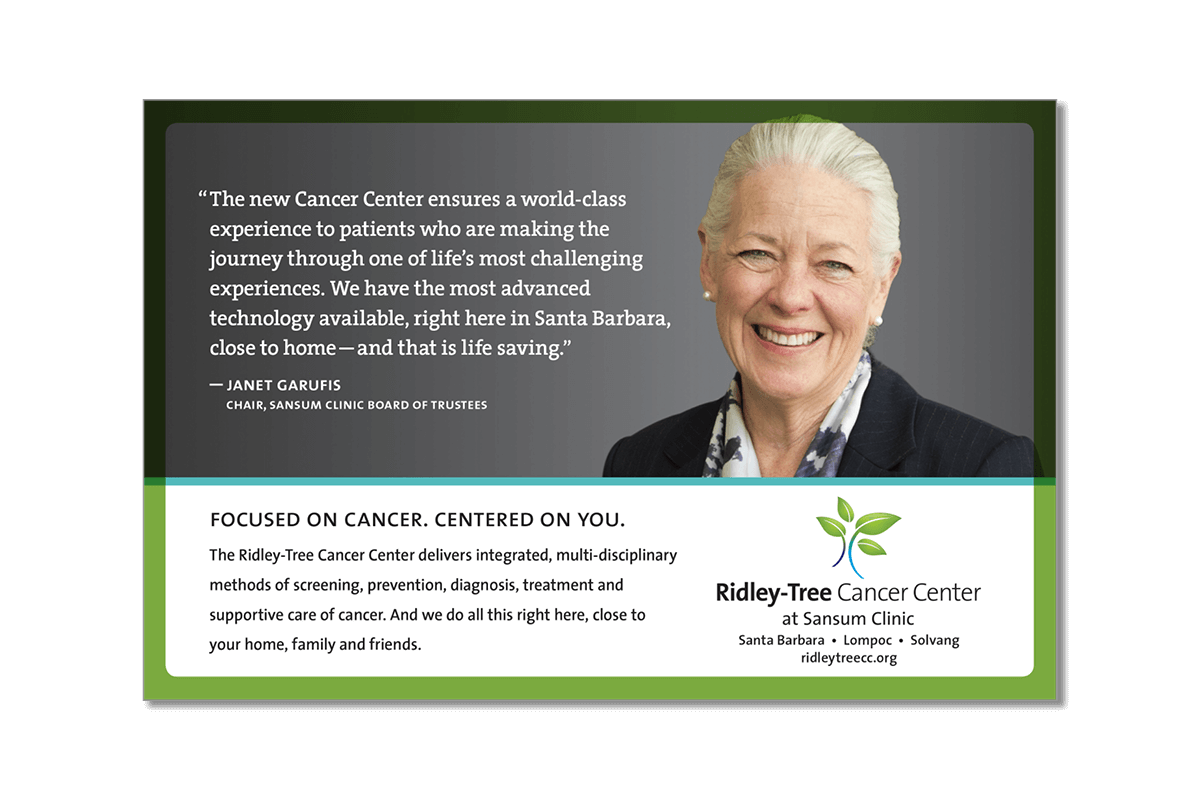 The Ridley Tree Cancer Center was built from the ground up to provide national-level physicians and technology to the Central-Coast region of California. Idea Engineering built branding that is complimentary but separate from RTCC’s parent, Sansum Clinic. And showing the warm, patient-centric of cancer care that Ridley Tree is renowned for.