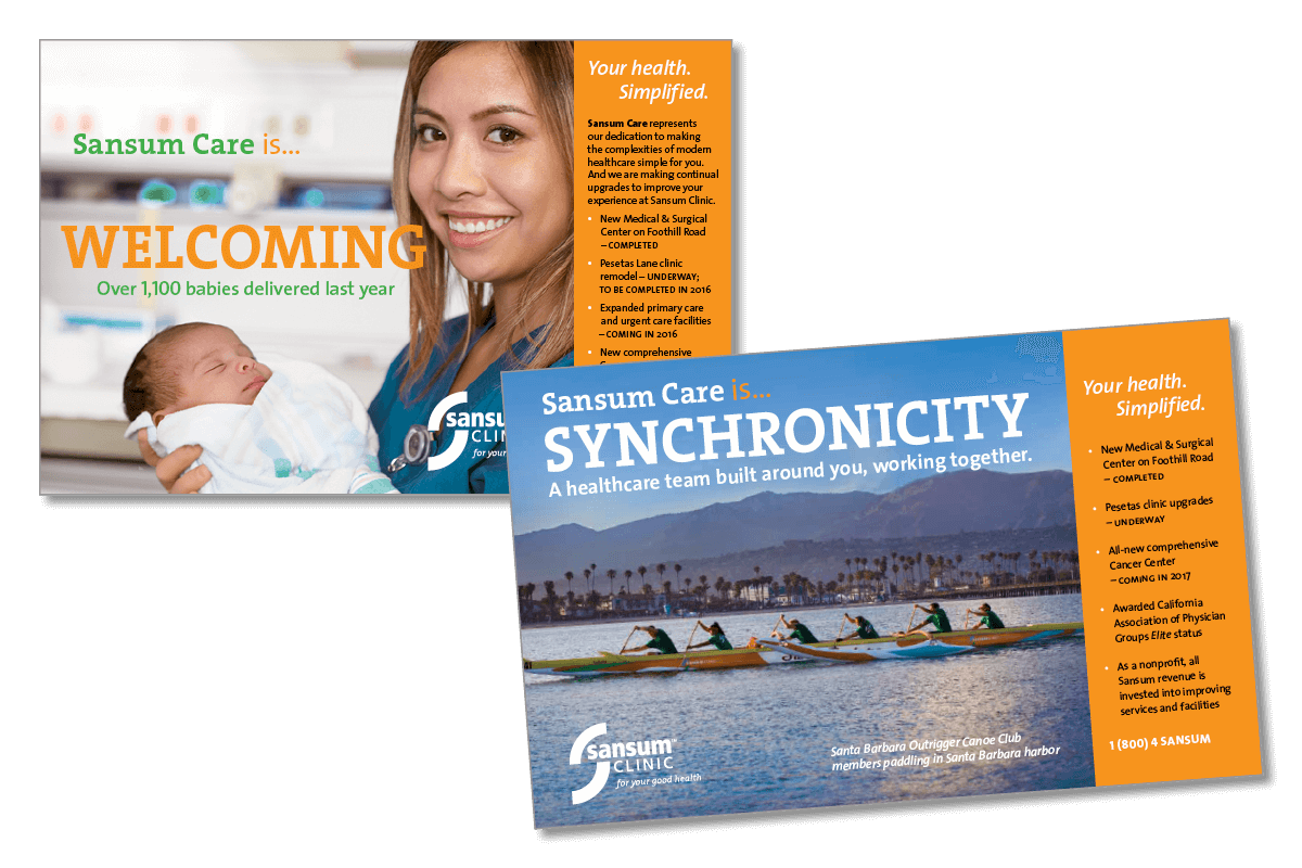 Although Sansum’s quality of care equals that to be found in major metropolitan areas, it has to combat the idea that better care could be found in Los Angeles or in single-specialty providers. IE worked on a rebrand for the organization. First to Sansum Clinic (from Sansum Santa Barbara Medical Foundation Clinic) and then to create a stronger and prouder relationship with the local community.